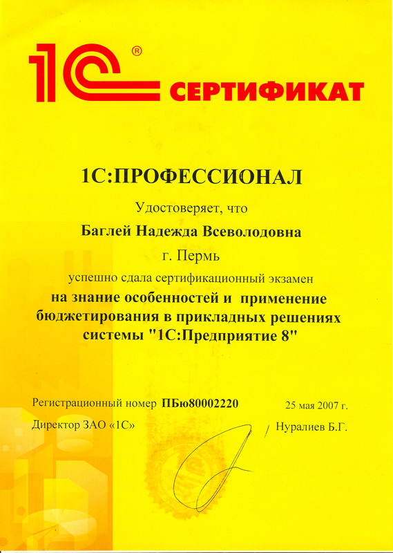 Данный сертификат подтверждает, что специалисты Пермской компании "Инфотэк" сертифицированы фирмой 1С и имеют компетенцию для внедрения бюджетирования при помощи ПП "1С:Управление производственным предприятием"